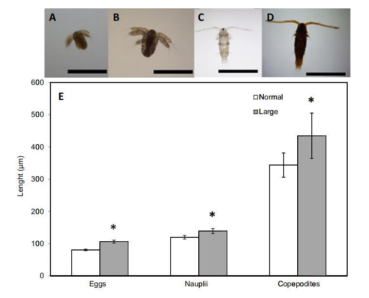 圖4。第1階段無節幼體(比例尺:200μm)和第1階段和第2階段橈足類(比例尺:400μm)由正常大小(A和C)和大型(B和D)卵孵化而成。從正常和大型卵子(E)孵化的個體的平均±SD卵子直徑、無節幼體(N1)和橈足類(C1–C2)長度。星號表示顯著差異。