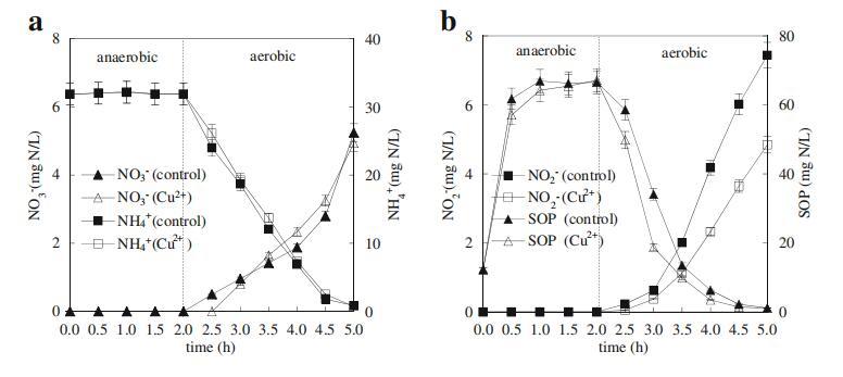 圖2添加100μg/L Cu2+對NH4+-N和NO3變化的影響?-N(a)、硫酸鉀和二氧化氮?-N(b)在一個厭氧-低溶解氧循環中。誤差條表示三種不同測量的標準偏差