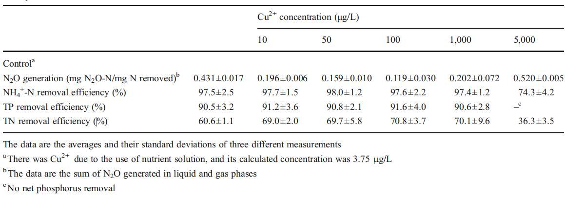 在本研究中,還測量了液體中的N2O生成量,并量化了總N2O(液相和氣相)。如表1所示,未添加Cu2+的反應器(即對照反應器)中的總N2O生成量為0.431 mg N2O-N/mg N。當Cu2+濃度為10μg/L時,N2O的生成量為0.196 mg N2O-N/mg N,當Cu2+濃度為100μg/L時,N2O的生成量進一步降低到0.119 mg N2O-N/mg N。然而,當Cu2+濃度增加到1000μg/L時,生成的N2O變為0.202 mg N2O-N/mg N。與對照組相比,進一步將Cu2+增加到5000μg/L會導致更高的N2O生成量(去除0.520 mg N2O-N/mg N)。因此,與對照相比,通過將廢水Cu2+濃度控制在10至100μg/L,可以減少54.4%至72.4%的N2O生成。