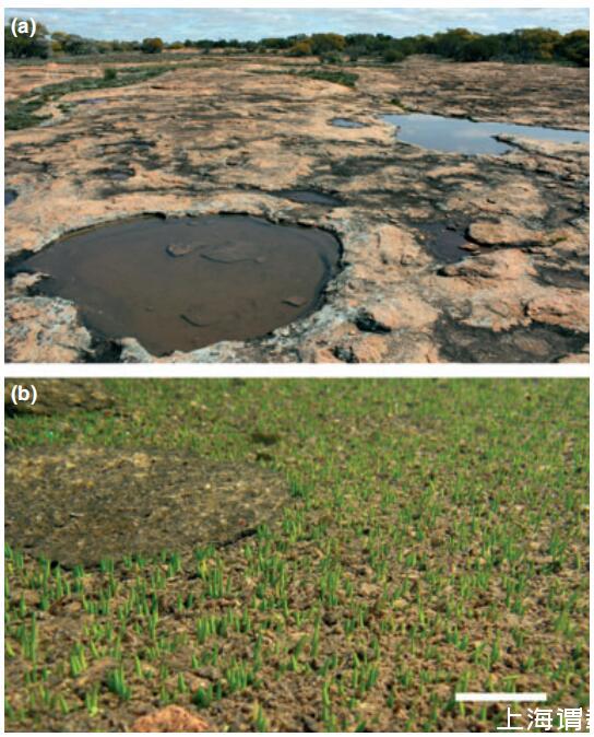 圖1澳大利亞西南部的臨時花崗巖巖池(a)和典型的水下植被(b)。臨時巖石池每年冬天都會有雨水供應(yīng),持續(xù)3-5個月。水淺(5–10 cm),電導率低(<10–80 lS cm)1);沉積物由風化花崗巖組成,有機質(zhì)含量低(2.3±0.6%DW;n=5),深度通常小于2 cm。然而,密集的水韭種群通常會發(fā)育(b),并且可以與其他植物(舌苔屬、厚殼水韭、Marselia和Eleocharis)共存,這是臨時花崗巖巖池的典型特征(Tuckett等人,2010)。巴,5厘米。