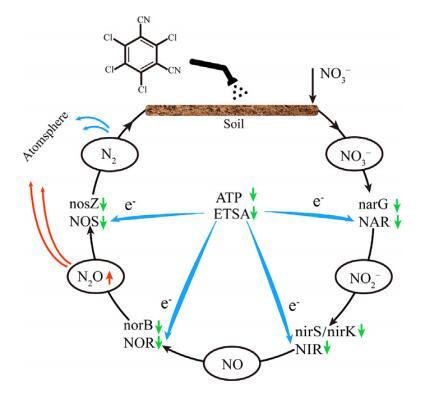 殺菌劑百菌清(CHT)因其高效、殺菌等優(yōu)點在茶園中得到廣泛應(yīng)用。據(jù)報道,反復(fù)施用CHT會抑制土壤硝化過程。然而,CHT對土壤反硝化和相關(guān)N2O排放的急性影響尚不清楚。本研究評估了硝酸鹽(NO3?)72℃高溫處理后茶園土壤的去除、反硝化基因豐度和反硝化酶活性。結(jié)果發(fā)現(xiàn),將CHT從5 mg kg增加到25 mg kg?1抑制NO3?去除效率從74.6%提高到54.1%,但N2O排放量從23.1%增加到94.8%。用25 mg kg治療后?在CHT中,nirK、nirS和nosZ基因的豐度分別降低了31.6%、22.1%和50.7%。另外,電子傳遞系統(tǒng)活性(ETSA)值和三磷酸腺苷(ATP)含量的下降表明CHT對微生物代謝有抑制作用。酶活性研究進一步表明,硝酸還原酶(NAR)、亞硝酸鹽還原酶(NIR)和一氧化氮還原酶(NOR)活性的降低是CHT抑制反硝化作用的主要原因。此外,反硝化還原酶活性與細胞內(nèi)代謝呈正相關(guān),表明微生物代謝的減少也應(yīng)是CHT對反硝化過程的抑制作用的原因。總的來說,研究發(fā)現(xiàn),土壤急性暴露于CHT可抑制反硝化過程并顯著增加N2O排放,這可能導(dǎo)致土壤氮循環(huán)破壞和全球變暖加劇。