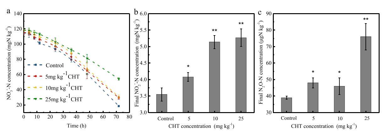 圖2百菌清(CHT)對NO3變化的影響?(a),最終編號2?反硝化過程中的濃度(b)和最終N2O生成(c)。誤差條表示三次測試的標準偏差。Tukey t檢驗,與對照組相比,*P b 0.05,**P b 0.01。