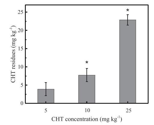 圖1.三種濃度的百菌清(CHT)(5、10和25 mg kg)的殘留?1)施用后72小時在土壤中。誤差條表示三次測試的標準偏差。A*以上數(shù)據(jù)表明對照組和CHT處理之間存在顯著差異(P b 0.05)。