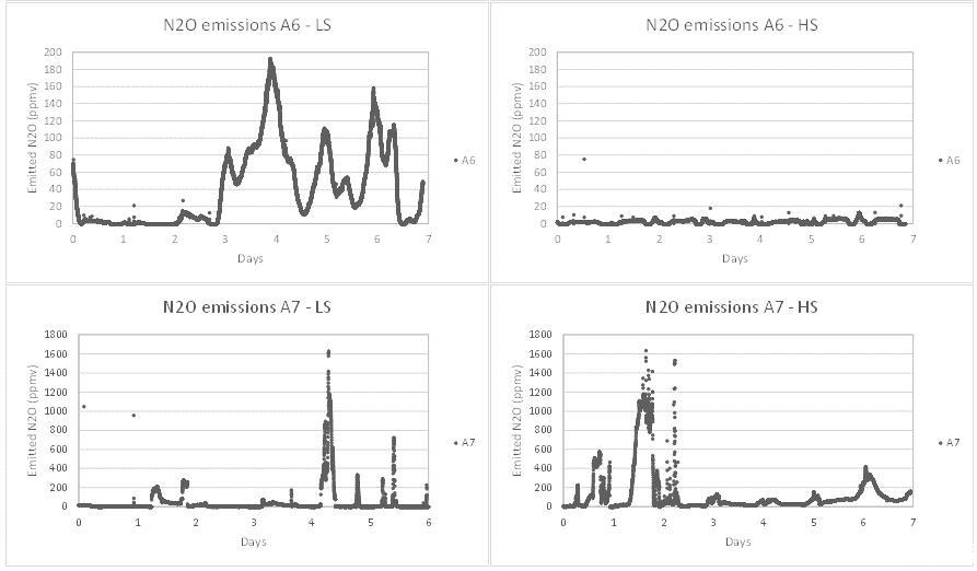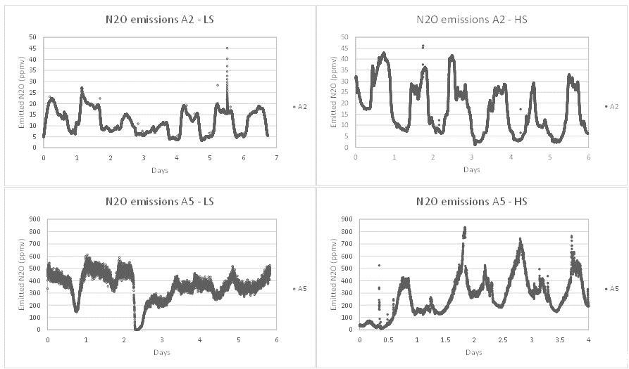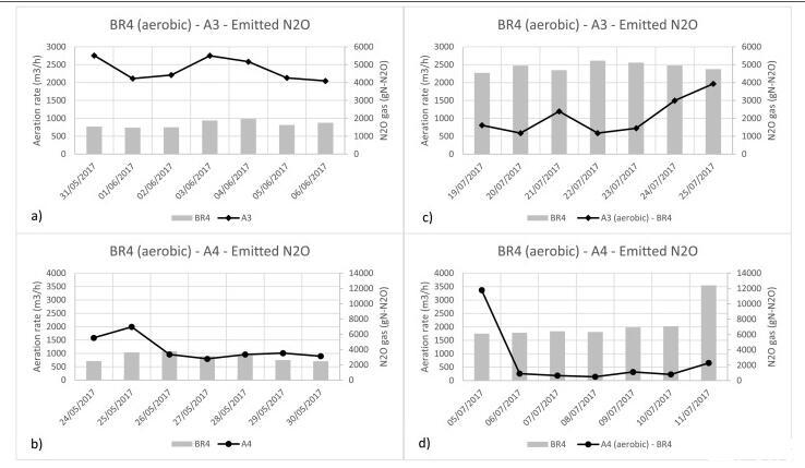 圖3、BR4淡季(LS)采樣位置a)A3和b)A4和BR4(HS)旺季采樣位置c)A3和d)A4的N2O排放和曝氣率比較。N2O排放的主要貢獻(xiàn)者是兩個季節(jié)的BR4,該反應(yīng)器中排放的每日動態(tài)(加上曝氣率)。HS期間的排放量低于LS期間。在LS期間,與HS相比,排放更不穩(wěn)定。