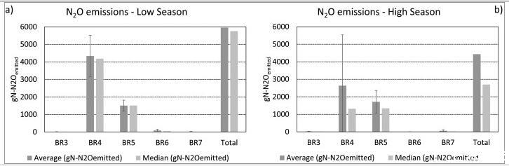 圖2、a)LS(淡季)和b)HS(旺季)期間反應(yīng)器的N2O排放。從圖中可以看出,在淡季發(fā)現(xiàn)了較高的總N2O排放量。生物反應(yīng)器4(BR4)對污水處理廠N2O總排放量的貢獻(xiàn)最大,其次是BR5,缺氧區(qū)(BR3和BR6)和最終好氧區(qū)(BR7)在兩個季節(jié)的貢獻(xiàn)均不顯著.旺季總排放量減少的主要原因是BR4的N2O排放率較低。