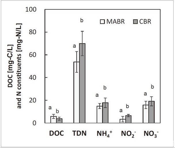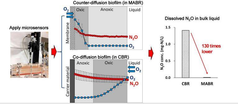 在本論文研究中,研究人員證明了SND的MABR可以減少N2O排放的概念。為此進(jìn)行了反應(yīng)器操作和原位生物膜深度研究此項研究揭示了(i)具有反擴(kuò)散生物膜幾何形狀的MABR是否允許比具有共擴(kuò)散生物膜幾何形狀的傳統(tǒng)生物膜反應(yīng)器(CBR)更低的N2O排放量;(ii)N2O還原菌豐度和活性的空間分布如何變化,在生物膜反擴(kuò)散生物膜中的微生物群落結(jié)構(gòu)是否不同取決于生物膜的深度。為了解決這些研究問題,研究人員將微電極技術(shù)(unisense)原位的測試出膜生物反應(yīng)器中生物膜中的氧氣及氧化亞氮的濃度,并與分子微生物學(xué)方法相結(jié)合。定量PCR和高通量測序技術(shù)16S rRNA基因擴(kuò)增,比較反擴(kuò)散和共擴(kuò)散生物膜。本研究是第一次直接比較MABR和CBR在整體和空間分解的N2O產(chǎn)量/減少和作為生物膜深度功能的微生物群落組成方面的結(jié)果。2種生物膜分別采用逆流和共流基質(zhì)擴(kuò)散結(jié)構(gòu),在相同負(fù)荷率下,對低DOC/TDN為1.0的高含氮廢水進(jìn)行同時硝化反硝化。上述研究結(jié)果證明了MABRs有望成為一種小足跡技術(shù),既能實現(xiàn)有效的同步硝化/反硝化,又能減緩N2O排放。