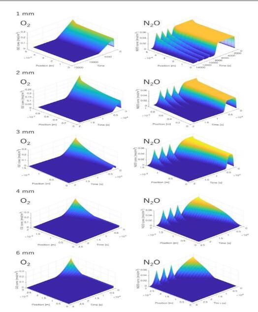 圖5、凝膠中O2和N2O濃度動態(tài)隨深度和時間的變化。軸上為零的位置表示凝膠的中心。