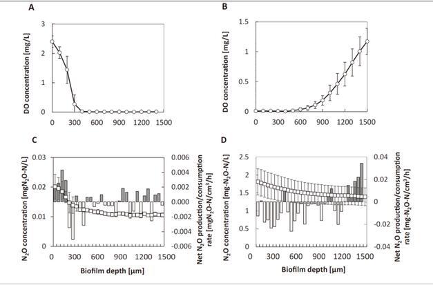 使用Clarktype微電極(Unisense,丹麥)測量整個生物膜深度內(nèi)溶解N2O和溶解氧(DO)濃度剖面,并連接皮安表(Unisense,奧爾胡斯,丹麥)進(jìn)行數(shù)據(jù)采集。氧氣微電極和N2O微電極的尖端直徑分別為50um和25um。在使用微電極測試生物膜之前,對每個微電極進(jìn)行了校準(zhǔn)。微操作器和微電極使用Sensor Trace Pro軟件精確控制微電極插入生物膜的位置(Unisense,丹麥)。在反應(yīng)器運行的第90天和第95天,在插入微電極的中間端口的10-15個點,獲得了N2O和O2濃度的生物膜深度分布。在假定穩(wěn)態(tài)條件下,利用菲克第二擴(kuò)散定律,估算了各濃度分布下的平均N2O凈容量消耗/生產(chǎn)速率。