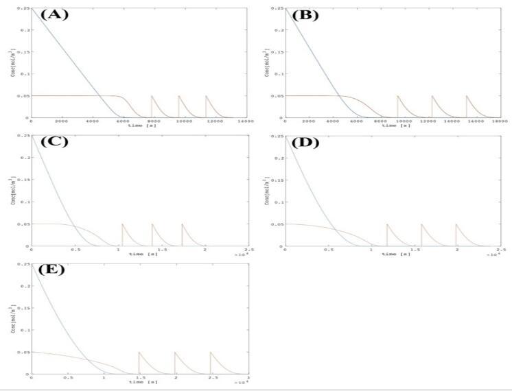 圖4、利用開發(fā)的模型模擬N2O(紅色)和O2(藍(lán)色)濃度隨時間的變化。球形凝膠的直徑設(shè)定為(A)1 mm,(B)2 mm,(C)3 mm,(D)4 mm,(E)6 mm。當(dāng)N2O濃度低于0.00005 mol/m3(0.05μM)時,N2O濃度會自動增加到初始濃度(0.05 mol/m3),實驗條件下觀察到的N2O峰值。這個過程重復(fù)了三次。