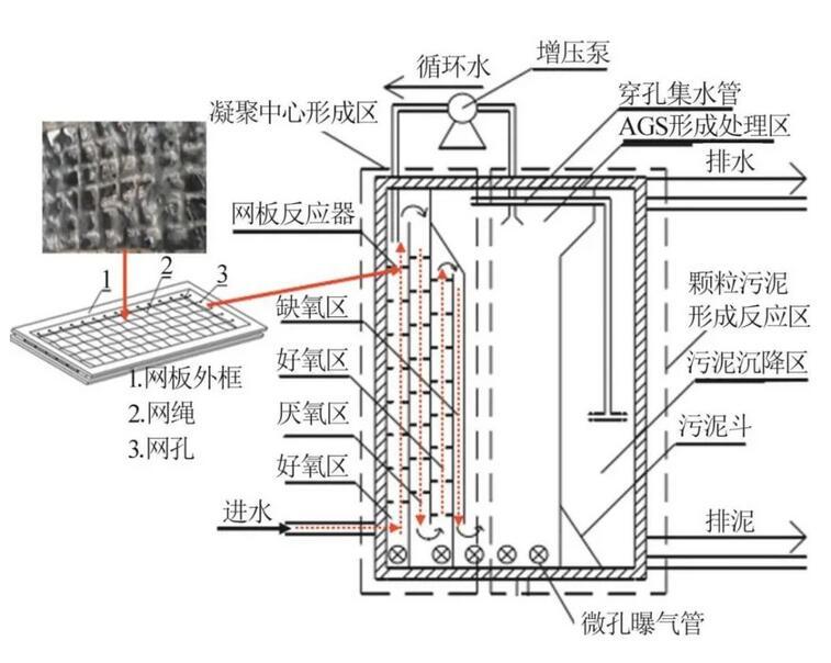 原水從反應器底部進水,在水流和上升氣流作用下由好氧區進入厭氧區,之后在重力作用下進入好氧及缺氧區,最后進入AGS形成與處理區。實現連續流AGS造粒的關鍵主要在于網板反應器能夠改善水力條件。