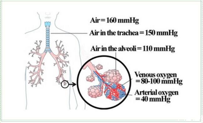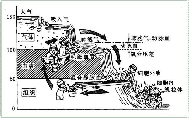 空氣中的氧濃度為20.95%,在海平面水平,大氣壓為760mmHg(101.33 kPa)時(shí),空氣中的氧分壓=(760-水蒸氣分壓)×20.95%。動(dòng)脈氧分壓PaO2是指以物理狀態(tài)溶解在動(dòng)脈血漿內(nèi)的氧分子所產(chǎn)生的張力。在100毫升37℃的血液內(nèi)、以物理狀態(tài)溶解的氧每0.003毫升可產(chǎn)生0.133kPa(1mmHg)的氧分壓。人類機(jī)體從大氣吸入的氧氣,通過上呼吸道、肺泡、肺毛細(xì)血管、動(dòng)脈血、全身毛細(xì)血管、細(xì)胞,最后到達(dá)細(xì)胞線粒體過程,氧分壓呈階梯式下降,如同幾層連續(xù)瀑布下落一樣,因此也稱為氧瀑布或氧降階梯(oxygen cascade)。