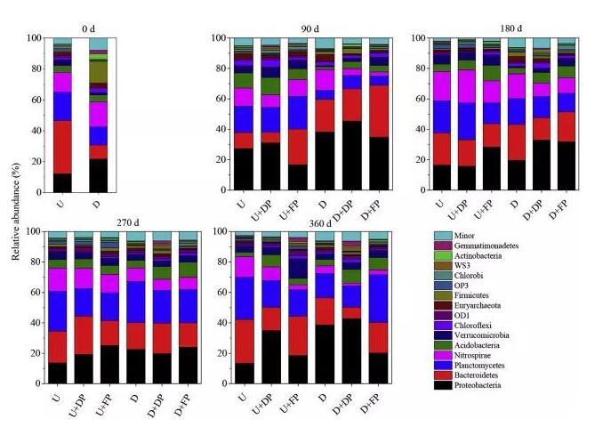 由物種組成可知,初始疏浚(0 d),在門水平,Proteobacteria、Firmicutes和Nitrospirae的相對豐度高于未疏浚組;隨著實驗進程,Bacteroidetes和Planctomycetes的相對豐度增加,與未疏浚組(270 d)相似。但Firmicutes的相對豐度在90 d內(nèi)急劇下降至未疏浚組的水平,而Proteobacteria一直維持著較高的豐度。值得注意的是,在疏浚沉積物中,Nitrospirae的相對豐度呈現(xiàn)出先降低(0-90 d)后增加(180-270 d)再降低至第360天最低水平的趨勢。