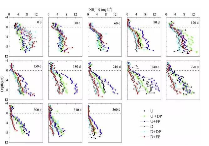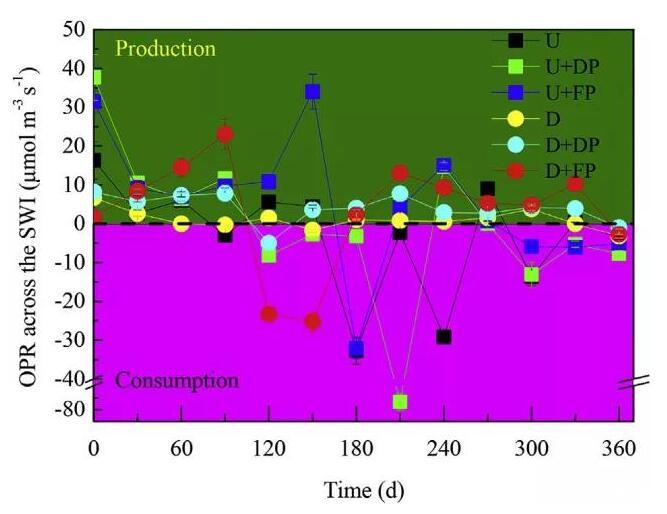 初始新鮮SPM的加入顯著降低了氧的產(chǎn)生/消耗速率(OPR)。D組的OPR在整個實驗進程中都近似為0,D+DP稍高于D組。加入新鮮的SPM后,D+FP組的的氧生成持續(xù)增加,120到150d,氧消耗速率較高是由于夏天微生物的呼吸作用增加所致。先前已有研究表明疏浚后氧(或氧化還原環(huán)境)在N素交換中起著重要作用;因此,SPM對OPR和氧氣滲透深度(OPD)的影響將對沉積物-水界面的N交換產(chǎn)生顯著的潛在影響。