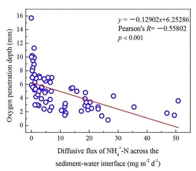 其次,SWI的氧化還原能力與N交換密切相關(guān)。此外,NH4+-N擴散通量和OPD呈顯著負相關(guān)(p<0.001),進一步證實了氧化還原能力與N交換的關(guān)系。