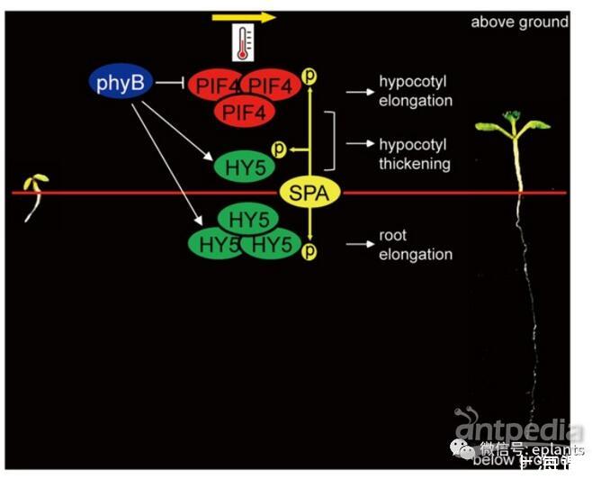 綜上所述,植物利用不同的轉(zhuǎn)錄因子以組織特異性的方式調(diào)節(jié)熱形態(tài)發(fā)生。PIF4-SPA模塊在下胚軸伸長中起關(guān)鍵作用,而HY5-SPA模塊在調(diào)控根的熱形態(tài)發(fā)生中起關(guān)鍵作用。此外,PIFS-HY5-SPA模塊調(diào)節(jié)下胚軸厚度以響應(yīng)環(huán)境溫度升高。