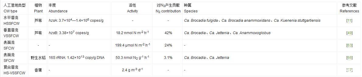 表2人工濕地系統中厭氧氨氧化菌的國內外研究概括