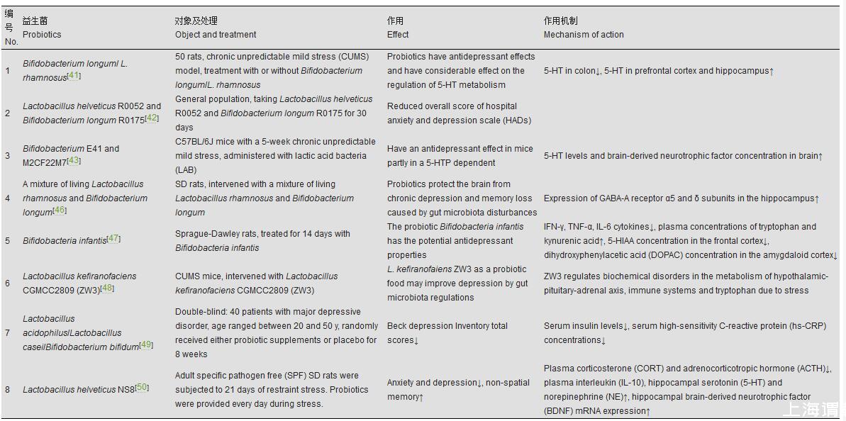 益生菌是一類對宿主有益的活性微生物,傳統益生菌主要來自雙歧桿菌屬(Bifidobacterium)、乳桿菌屬(Lactobacillus)和其他一些乳酸菌(lactic acid bacteria,LAB)或酵母菌(yeast)等,補充益生菌可以改變腸道菌群的構成和功能[40]。雖然腸道微生物群與抑郁之間存在復雜關系,但可以通過益生菌調節來改善抑郁癥狀;表1列出了不同種類益生菌對抑郁癥狀的改善情況。有研究表明,益生元和益生菌具有抗抑郁作用,對血清素(5-hydoxytryptamine,5-HT)代謝的調節具有相當大的作用,尤其是鼠李糖乳桿菌[41]。在普通人群中證明,瑞士乳桿菌R0052和長雙歧桿菌R0175聯合服用30 d,可以減少醫院焦慮和抑郁量表的整體評分[42]。有研究證明了E41和M2CF22M7可以通過調節五羥基色氨酸(5-hydroxytryptophan,5-HTP)合成來獲得抗抑郁作用[43]。益生菌與抑郁癥的顯著減少相關,非抑郁癥患者可以通過接受口服益生菌來降低患抑郁癥的風險[44]。補充益生菌能改善抑郁大鼠的情緒狀態,影響各種生化指標及腦單胺類神經遞質等[45]。研究結果表明:幼年腸道微生物群紊亂可誘導慢性抑郁和記憶喪失,并降低成年大鼠海馬中GABA-A受體α5和δ亞基的表達;此外,與短期苯二氮卓類藥物治療相比,適度益生菌給藥可顯著改善抑郁、記憶癥狀[46]。益生菌雙歧桿菌處理Sprague-Dawley(SD)大鼠14 d后,血清干擾素-γ(serum interferon-γ,IFN-γ)、腫瘤壞死因子-α(tumor necrosis factor-α,TNF-α)和白介素-6(interleukin-6,IL-6)細胞因子顯著減弱;此外,與對照組相比,雙歧桿菌處理的SD大鼠中,色氨酸和犬尿喹啉酸的血漿濃度顯著增加;雙歧桿菌處理還導致額葉皮質中5-羥吲哚乙酸(5-hydroxyindole acetic acid,5-HIAA)濃度降低[47]。乳酸桿菌ZW3可調節腸道微生物群的組成,可能通過調節腸道微生物群作為益生菌食物來改善抑郁[48]。一項雙盲試驗表明,服用益生菌補充劑的患者貝克抑郁量表總分顯著降低[49]。有研究表明瑞士乳桿菌NS8對慢性束縛應激抑郁大鼠具有抗抑郁作用[50]。有更多證據表明可以使用益生菌治療焦慮和抑郁,但與精神科藥物相比,任何形式的益生菌都不能被認為是對焦慮和抑郁的可靠治療。此外,性別差異以及肥胖、生活方式、煙草和酒精使用等合并癥可能會影響益生菌的總體益處[51]。補充益生菌可減少重度抑郁癥中常見的炎癥反應,是一種很有前景的輔助治療抑郁癥方法[52]。益生菌治療抑郁癥的效果有待進一步的臨床試驗和實驗研究驗證,具體作用機制還需要進一步闡明。腸道益生菌可以代謝中藥有效成分,中藥有效成分對腸道益生菌具有調節作用[53],而從中藥有效成分角度探討益生菌與抑郁癥之間相互作用的研究仍較少,是將來研究的一個重要方向。