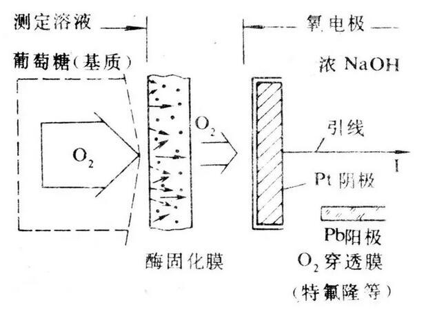 葡萄糖氧化產(chǎn)生H2O2,而H2O2通過選擇性透氣膜,在Pt電極上氧化,產(chǎn)生陽極電流。葡萄糖含量與電流成正比,由此可測出葡萄糖溶液濃度。