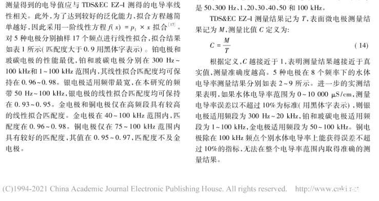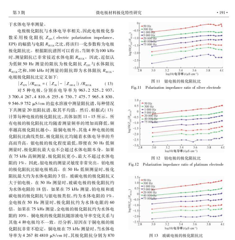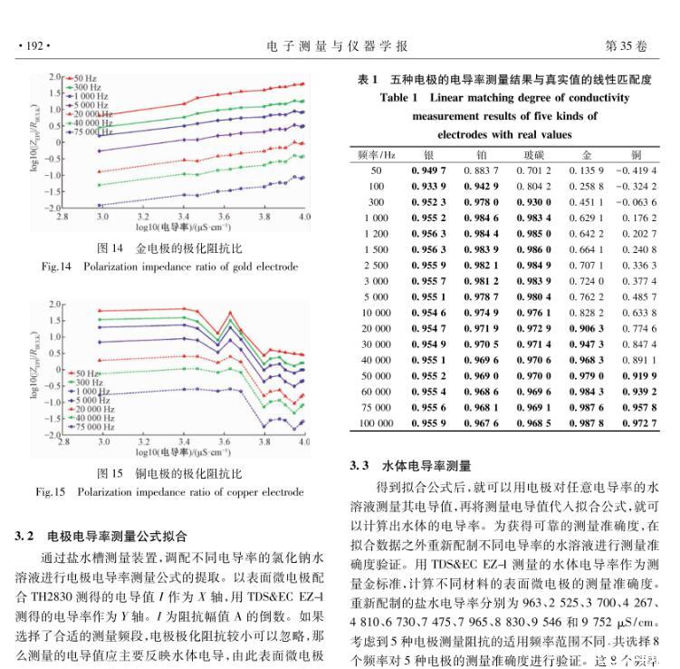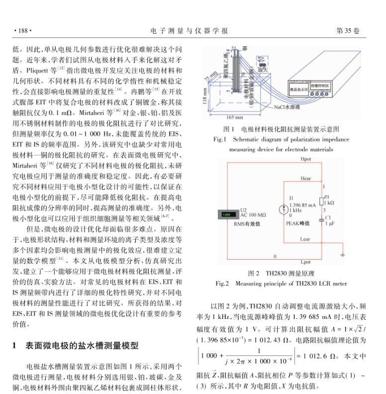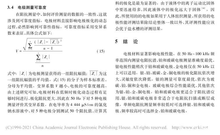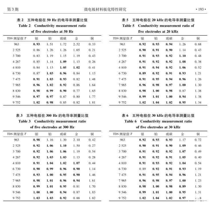 為了研究銀、鉑、玻碳、金、銅電極的極化特性,確定每種材料電極的最佳應用場景,對表面微電極型式進行了詳細的理論分析、模型仿真和水槽測量研究,獲得了一種表面微電極材料極化阻抗評測方法。結果表明,鉑和玻碳電極測量準確度最優,銀電極性能稍次于鉑和玻碳電極,金電極僅在50 kHz以上可以適用。綜合準確度、靈敏度和可靠度,玻碳電極綜合性能最優,其余依次為銀、鉑、金、銅電極。鉑和玻碳電極更適合于阻抗譜應用,銀、鉑和玻碳電極非常適合于電阻抗掃描或斷層成像。單頻電阻抗測量頻率較低時可選擇銀、鉑和玻碳電極,頻率較高時可選擇金、鉑和玻碳電極。