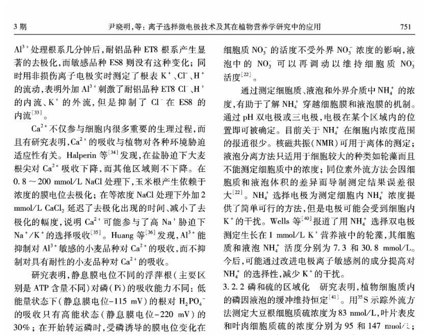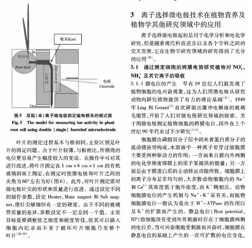 【摘要】:離子選擇微電極(Ion selective microelectrode)起初是用于化學分析和電化學研究,隨著電生理學的發展而發展。離子選擇微電極的制備和工作原理主要有:1)雙電極制備過程包括離子敏感劑(Sensor)的配制、電極拉制、硅烷化和敏感劑Sensor的灌注、電極的標定等;2)離子選擇微電極的工作原理與其它類型的電極主要不同在于,微電極中所灌敏感劑的離子濃度和細胞中離子的濃度存在著濃度差,因此會產生離子及其所帶電荷的移動,并且敏感劑只對某種離子有專一的選擇通透性,離子專一地穿過生物膜、敏感膜而產生的膜電位差值和該離子的活度存在對數曲線的關系,離子的活度可以通過修正后的能斯特方程計算出。離子選擇微電極技術在植物營養學領域中的應用主要包括以下方面:NH4+、NO3-、K+、Ca2+等穿膜運輸的生理過程和能量驅動以及在細胞內的區域化分布;不同營養條件下質外體養分離子、pH值等生理指標的變化以及逆境條件下電信號的傳導等方面。今后,離子選擇微電極應進一步提高專一性、選擇性,并簡化儀器裝備、使之能走出實驗室,為作物的營養診斷提供技術支持,以更好地服務農業生產。