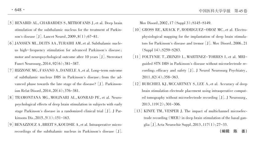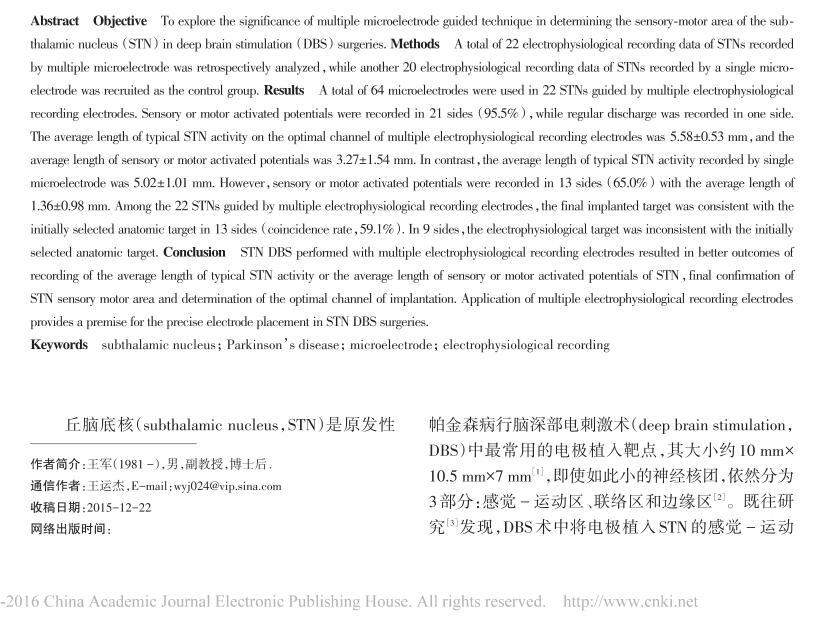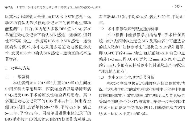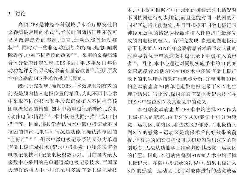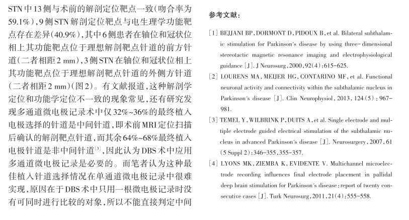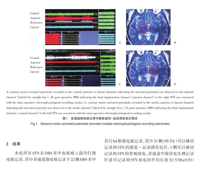 22側STN多通道微電極記錄下13側最終選擇靶點與術前的解剖定位一致,吻合率為59.1%,9側STN解剖定位靶點與電生理學功能靶點存在差異。結論DBS術中多通道微電極記錄與單通道微電極記錄相比,在記錄到的STN放電的平均長度、感覺-運動誘發電位平均長度、確認STN感覺-運動區概率及選擇最佳植入針道等多方面均有明顯優勢,這對DBS術中確保植入電極位置的精準提供了前提。
