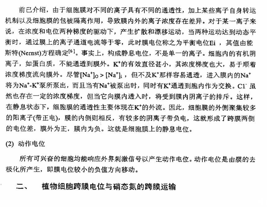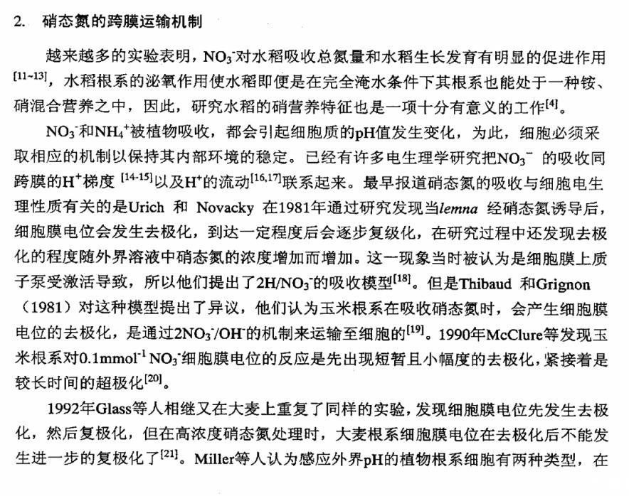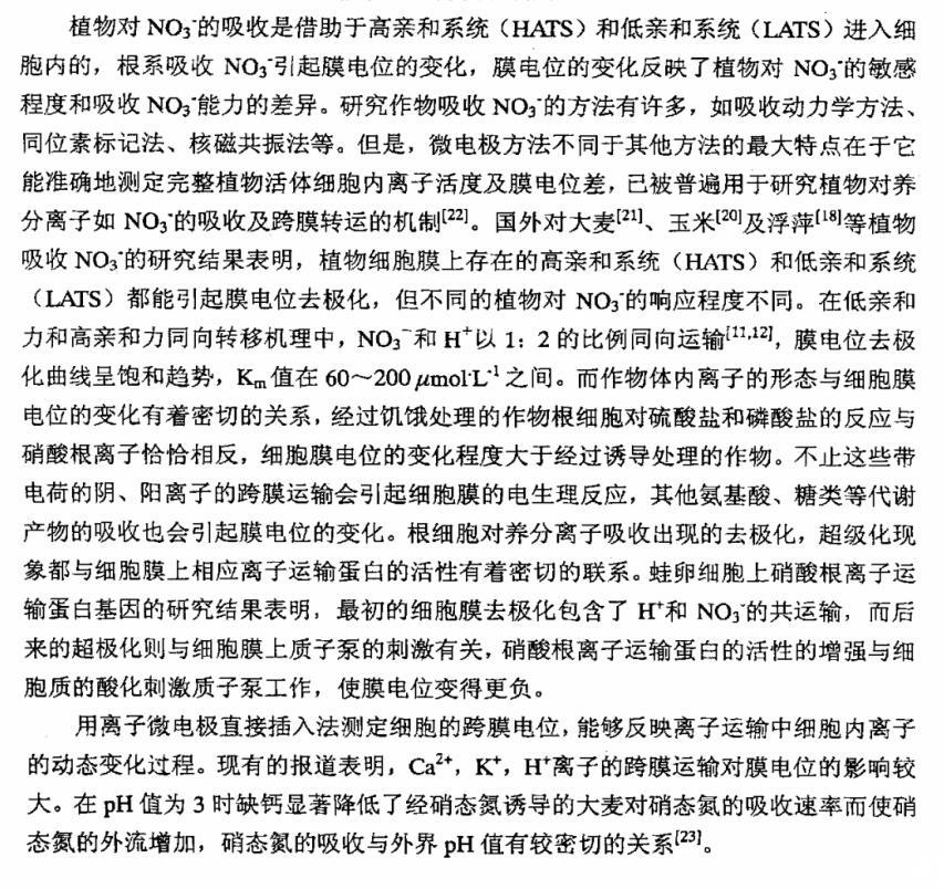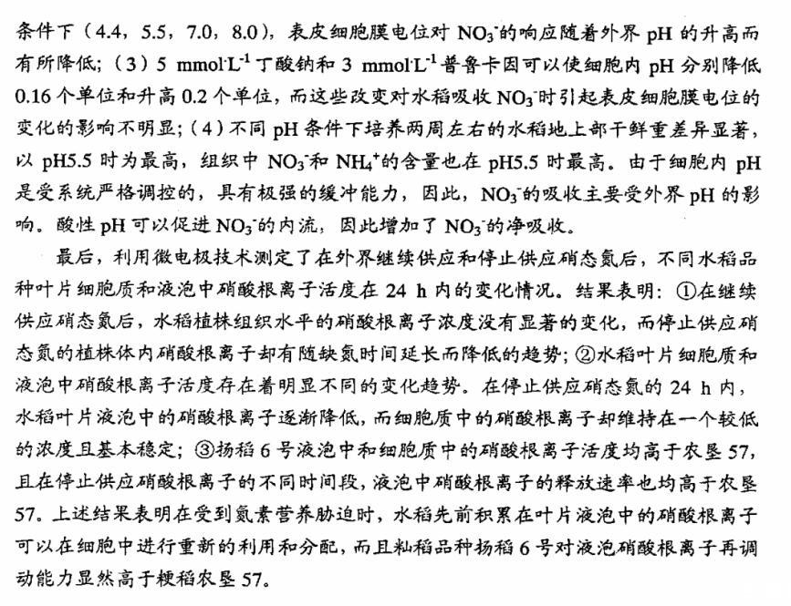 用微電極測定發現用含有5mmol·L~(-1)NO_3~-的營養液誘導48h后的六葉期小白菜,葉片細胞中硝酸根離子活度分布在活度高低明顯不同的兩個區間內:細胞質中是0.24~10mmol·L~(-1),液泡中20~110mmol·L~(-1),且兩個區間在細胞跨膜電位上也有差異。液泡占整個細胞體積的90%,所以,植物所吸收的硝酸根離子都集中在液泡中。其次,運用單孔微電極插入法研究了在不同細胞內外pH值的條件下,水稻——常規秈稻(楊稻6號)吸收NO_3~-時細胞膜電位的響應特征。結果表明:(1)大多數情況下,未經NO_3~-培養的水稻根表皮細胞吸收NO_3~-會引起細胞膜電位瞬時的去極化,偶爾會產生膜電位的超級化。當水稻根系吸收NO_3~-時,表皮細胞膜電位改變的程度隨外界NO_3~-濃度的增大而增大,在濃度為0.5mmol·L~(-1)時達到最大;(2)在不同外界pH
