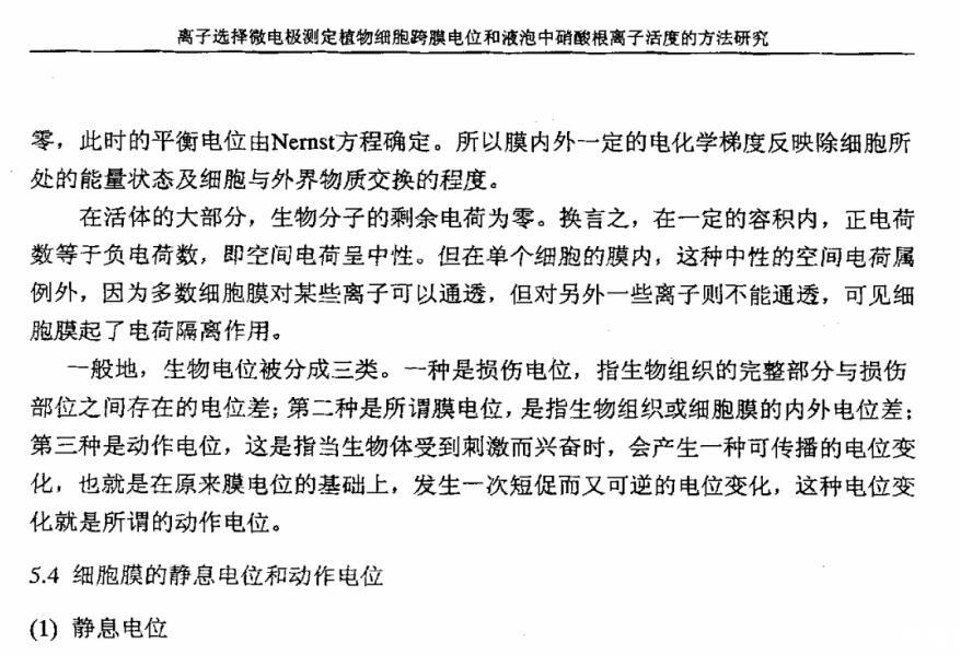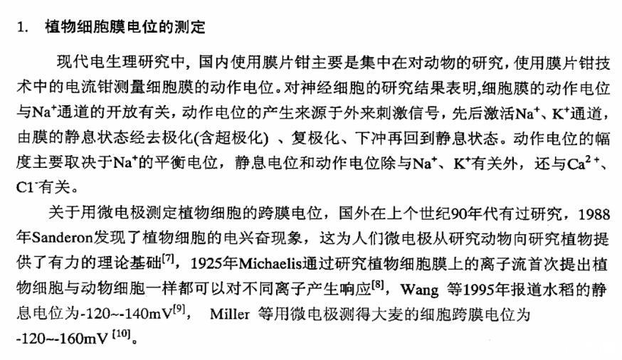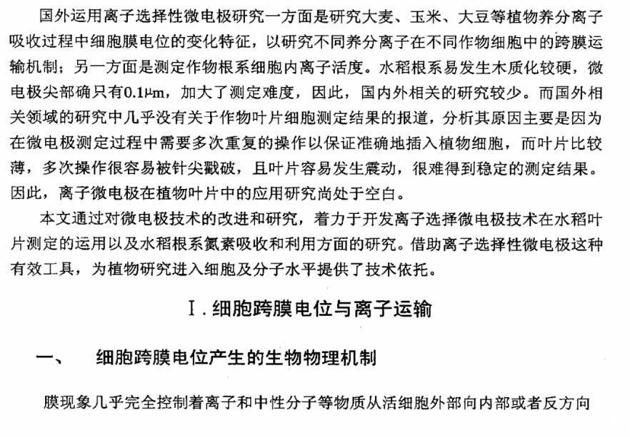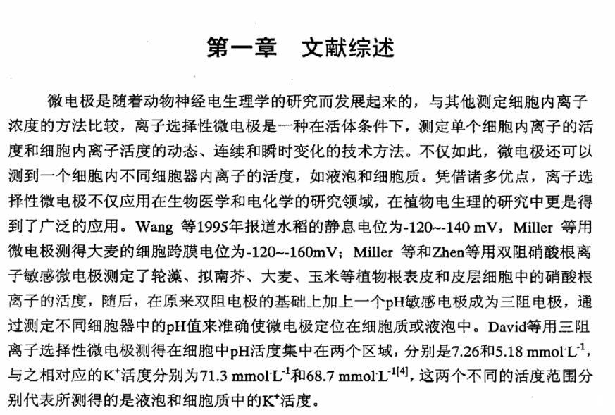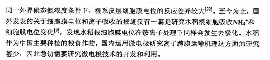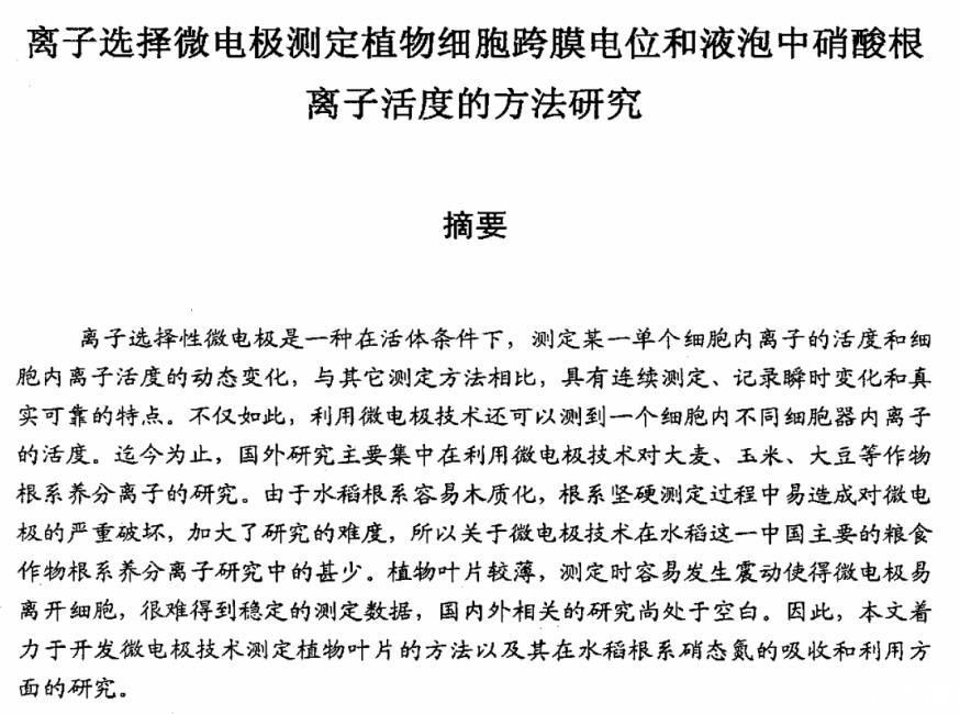 【摘要】:離子選擇性微電極是一種在活體條件下,測定某一單個細胞內離子的活度和細胞內離子活度的動態變化,與其它測定方法相比,具有連續測定、記錄瞬時變化和真實可靠的特點。不僅如此,利用微電極技術還可以測到一個細胞內不同細胞器內離子的活度。迄今為止,國外研究主要集中在利用微電極技術對大麥、玉米、大豆等作物根系養分離子的研究。由于水稻根系容易木質化,根系堅硬測定過程中易造成對微電極的嚴重破壞,加大了研究的難度,所以關于微電極技術在水稻這一中國主要的糧食作物根系養分離子研究中的甚少。