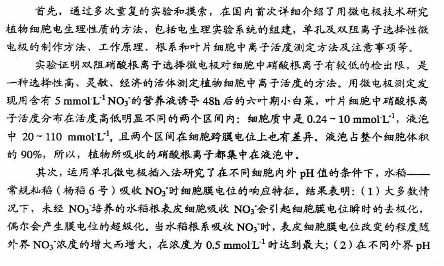 植物葉片較薄,測定時容易發生震動使得微電極易離開細胞,很難得到穩定的測定數據,國內外相關的研究尚處于空白。因此,本文著力于開發微電極技術測定植物葉片的方法以及其在水稻根系硝態氮的吸收和利用方面的研究。首先,通過多次重復的實驗和摸索,在國內首次詳細介紹了用微電極技術研究植物細胞電生理性質的方法,包括電生理實驗系統的組建,單孔及雙阻離子選擇性微電極的制作方法、工作原理、根系和葉片細胞中離子活度測定方法及注意事項等。實驗證明雙阻硝酸根離子選擇微電極對細胞中硝酸根離子有較低的檢出限,是一種選擇性高、靈敏、經濟的活體測定植物細胞中離子活度的方法。
