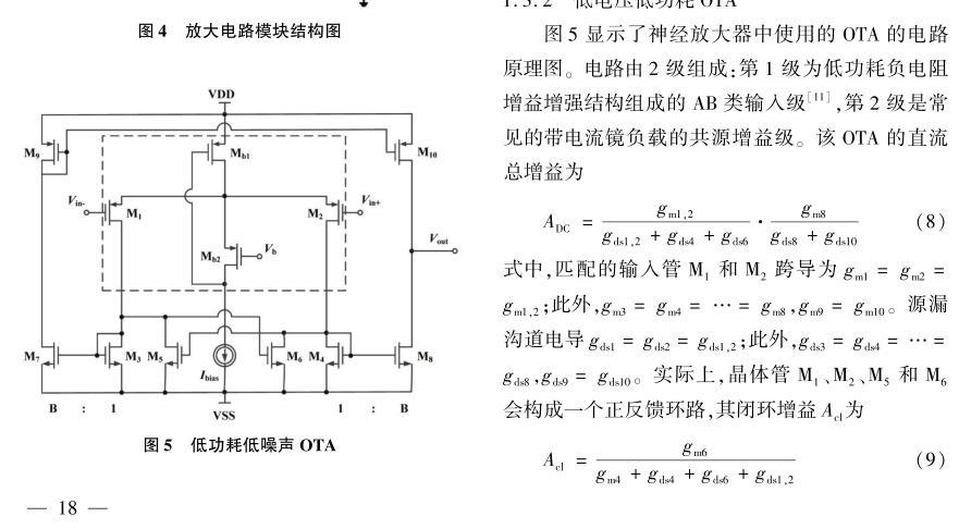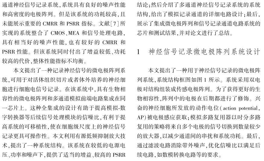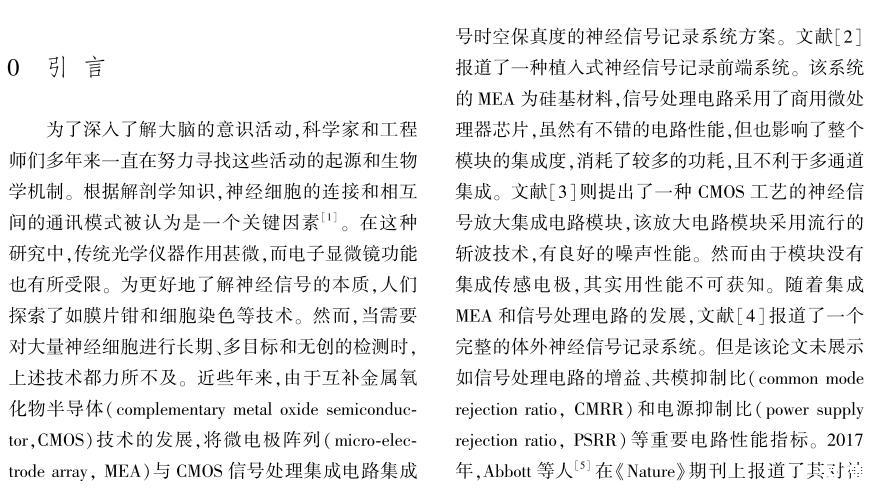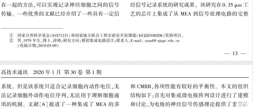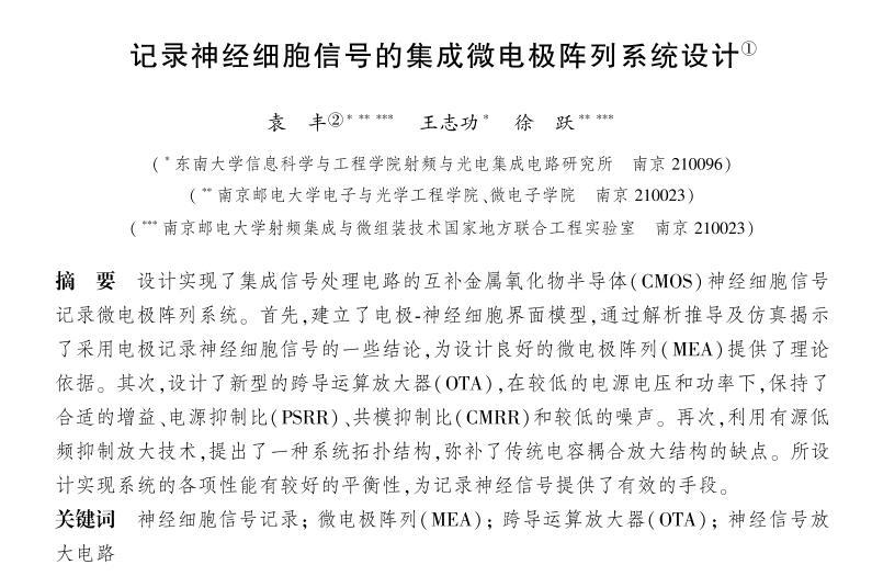 【摘要】:設計實現(xiàn)了集成信號處理電路的互補金屬氧化物半導體(CMOS)神經(jīng)細胞信號記錄微電極陣列系統(tǒng)。首先,建立了電極-神經(jīng)細胞界面模型,通過解析推導及仿真揭示了采用電極記錄神經(jīng)細胞信號的一些結(jié)論,為設計良好的微電極陣列(MEA)提供了理論依據(jù)。其次,設計了新型的跨導運算放大器(OTA),在較低的電源電壓和功率下,保持了合適的增益、電源抑制比(PSRR)、共模抑制比(CMRR)和較低的噪聲。再次,利用有源低頻抑制放大技術,提出了一種系統(tǒng)拓撲結(jié)構,彌補了傳統(tǒng)電容耦合放大結(jié)構的缺點。所設計實現(xiàn)系統(tǒng)的各項性能有較好的平衡性,為記錄神經(jīng)信號提供了有效的手段。