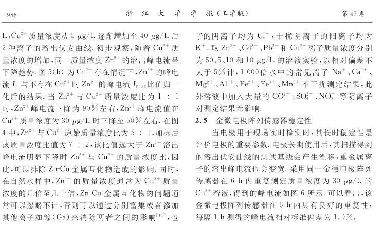 【摘要】:基于溶出伏安法,采用一種新型的汞膜金微電極陣列傳感器芯片,實現了水污染痕量重金屬離子Zn2+、Cd2+、Pb2+和Cu2+的同時檢測.在K3[Fe(CN)6]溶液中對微電極陣列傳感器進行循環伏安掃描,分析其電化學特性及實際表面積,采用電化學阻抗譜法檢驗微電極陣列傳感器表面汞膜沉積的程度。鍍汞后的微電極陣列傳感器采用差分脈沖陽極溶出伏安法,同時檢測樣本溶液中的重金屬元素:Zn2+、Cd2+、Pb2+和Cu2+,得到的Cd2+、Pb2+和Cu2+的標準工作曲線線性度良好,檢測下限分別為0.1、0.5和0.3μg/L,但Zn2+的標準工作曲線線性度較差,這主要是由測試基線的漂移及不準確的加標造成的。