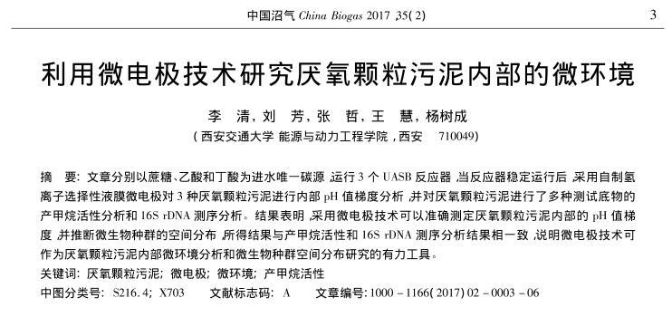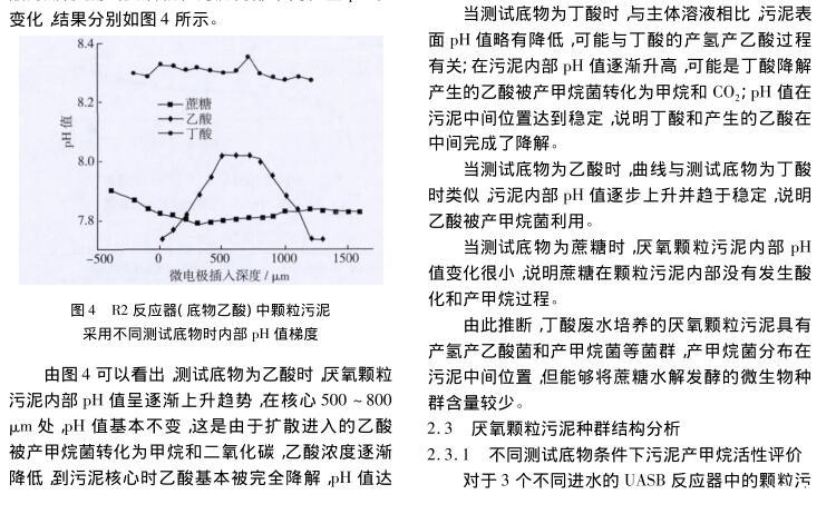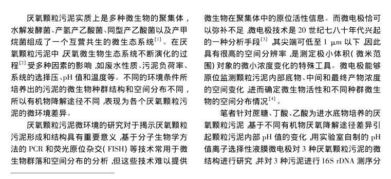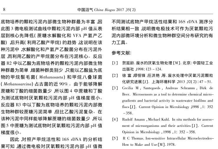 【摘要】:文章分別以蔗糖、乙酸和丁酸為進(jìn)水唯一碳源,運(yùn)行3個(gè)UASB反應(yīng)器,當(dāng)反應(yīng)器穩(wěn)定運(yùn)行后,采用自制氫離子選擇性液膜微電極對(duì)3種厭氧顆粒污泥進(jìn)行內(nèi)部pH值梯度分析,并對(duì)厭氧顆粒污泥進(jìn)行了多種測(cè)試底物的產(chǎn)甲烷活性分析和16S rDNA測(cè)序分析。結(jié)果表明,采用微電極技術(shù)可以準(zhǔn)確測(cè)定厭氧顆粒污泥內(nèi)部的pH值梯度,并推斷微生物種群的空間分布,所得結(jié)果與產(chǎn)甲烷活性和16S rDNA測(cè)序分析結(jié)果相一致,說(shuō)明微電極技術(shù)可作為厭氧顆粒污泥內(nèi)部微環(huán)境分析和微生物種群空間分布研究的有力工具。