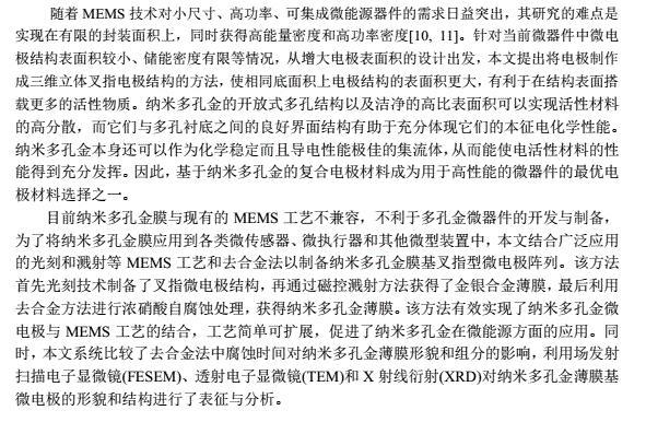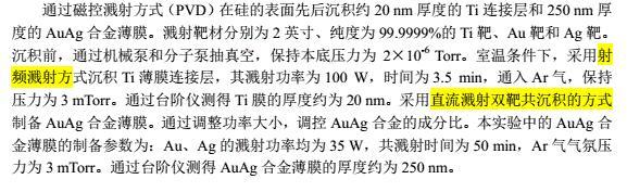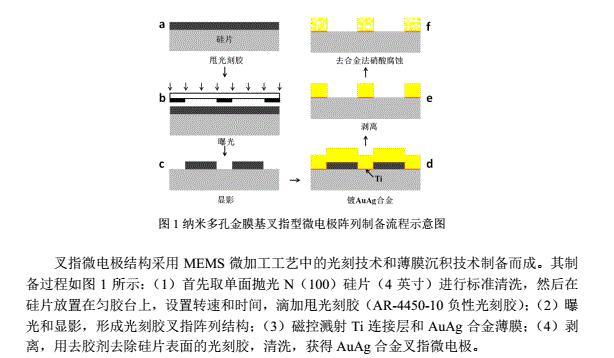 【摘要】:結合磁控濺射、lift-off工藝和脫合金法制備了納米多孔金薄膜及其微電極結構。首先利用磁控濺射法和lift-off技術制備了金銀合金叉指型微薄膜電極結構,然后采用濃硝酸通過脫合金方法進一步制備出納米多孔金薄膜微電極結構。
