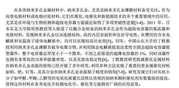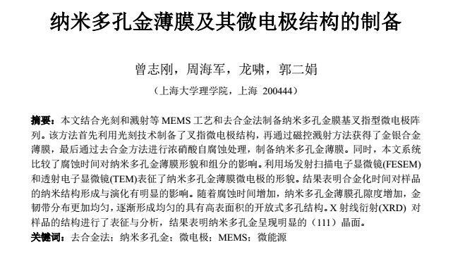 本文系統研究了腐蝕時間對磁控濺射金銀合金薄膜去合金化所制備的納米多孔金薄膜形貌、組分和結構的影響。利用X射線衍射、場發射掃描電子顯微鏡和透射電子顯微鏡表征了納米多孔金薄膜微電極的結構和形貌。結果表明納米多孔金主要呈現(111)晶面,且脫合金時間對納米多孔結構形成與演化有明顯的影響。
