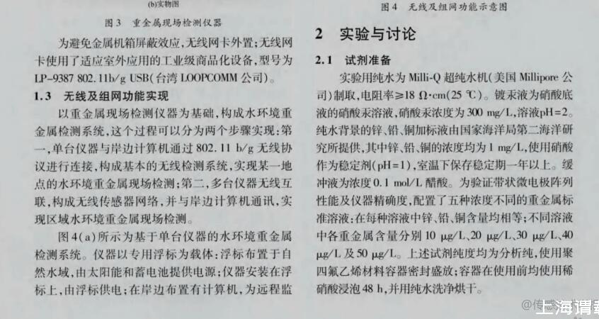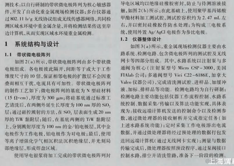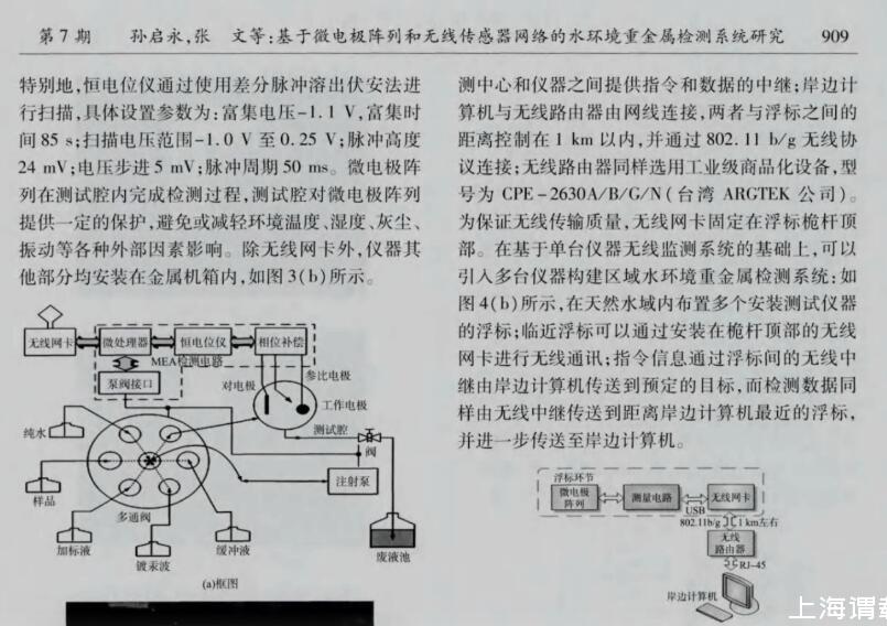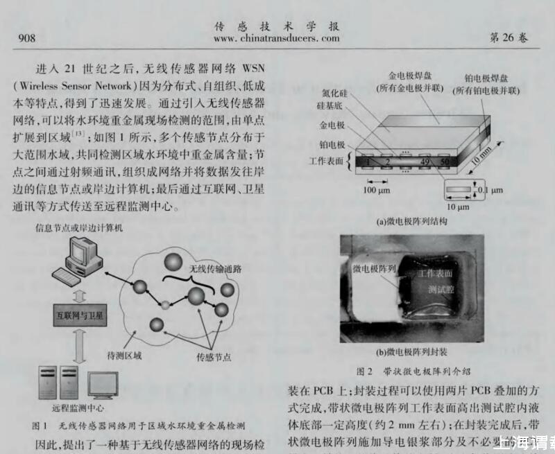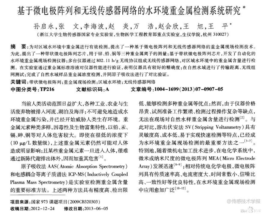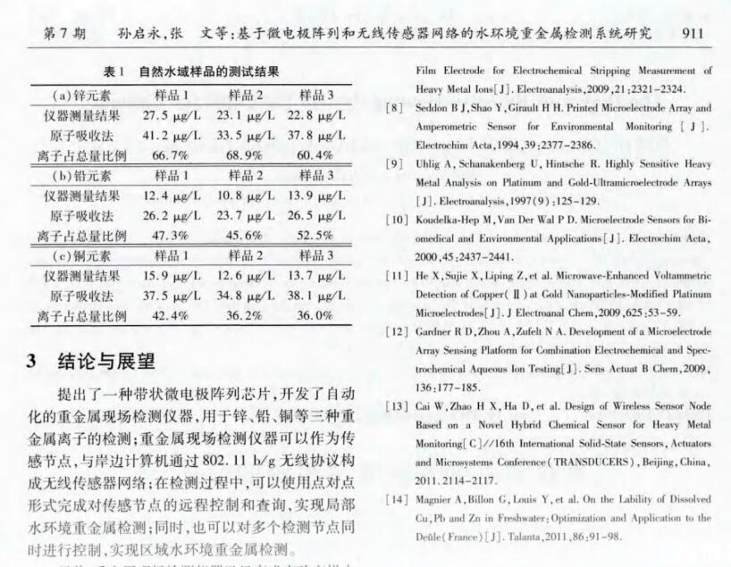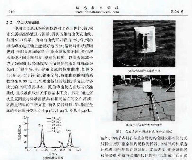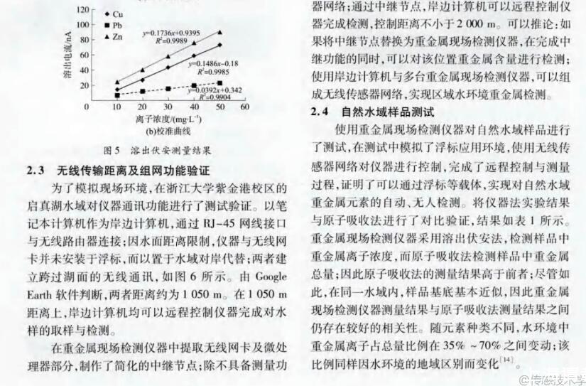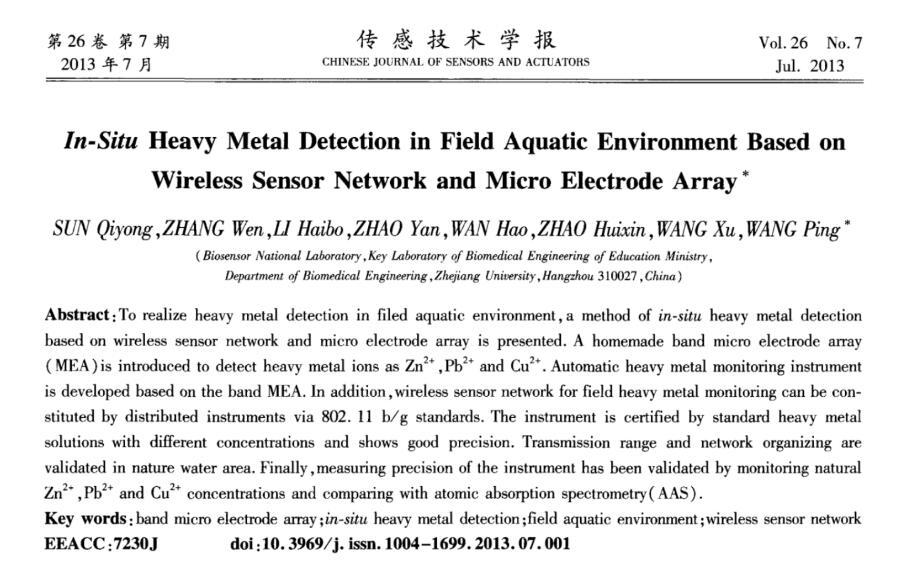 【摘要】:為對區(qū)域水環(huán)境中重金屬進行有效檢測,提出了一種基于微電極陣列和無線傳感器網絡的重金屬現(xiàn)場檢測技術。為此,提出了一種帶狀微電極陣列芯片,用于鋅、鉛、銅等三種重金屬離子的測量;基于帶狀微電極陣列芯片,開發(fā)了自動化的水環(huán)境重金屬現(xiàn)場檢測儀器;多臺儀器通過802.11 b/g無線協(xié)議組成無線傳感器網絡,對區(qū)域水環(huán)境中的重金屬含量進行檢測。在實驗室通過重金屬標準溶液對儀器性能進行驗證,表明儀器具有較好的精確度;在自然水域進行了傳輸距離、無線組網測試;完成了自然水域樣品重金屬濃度檢測,并同原子吸收法進行了對比驗證。