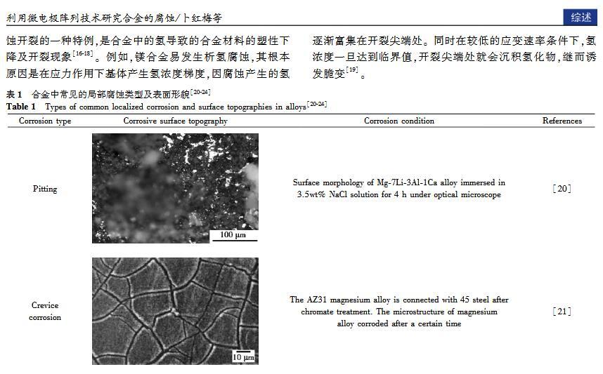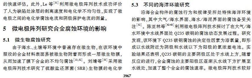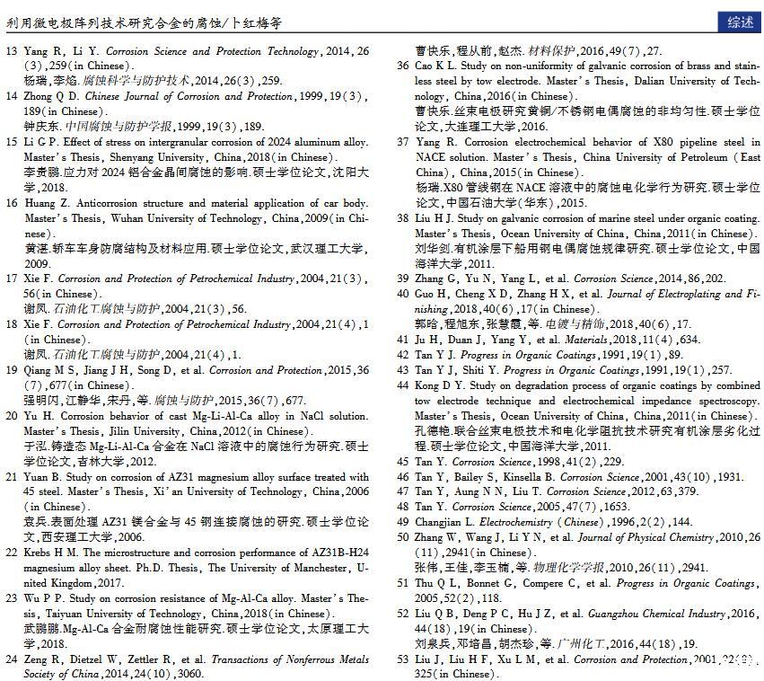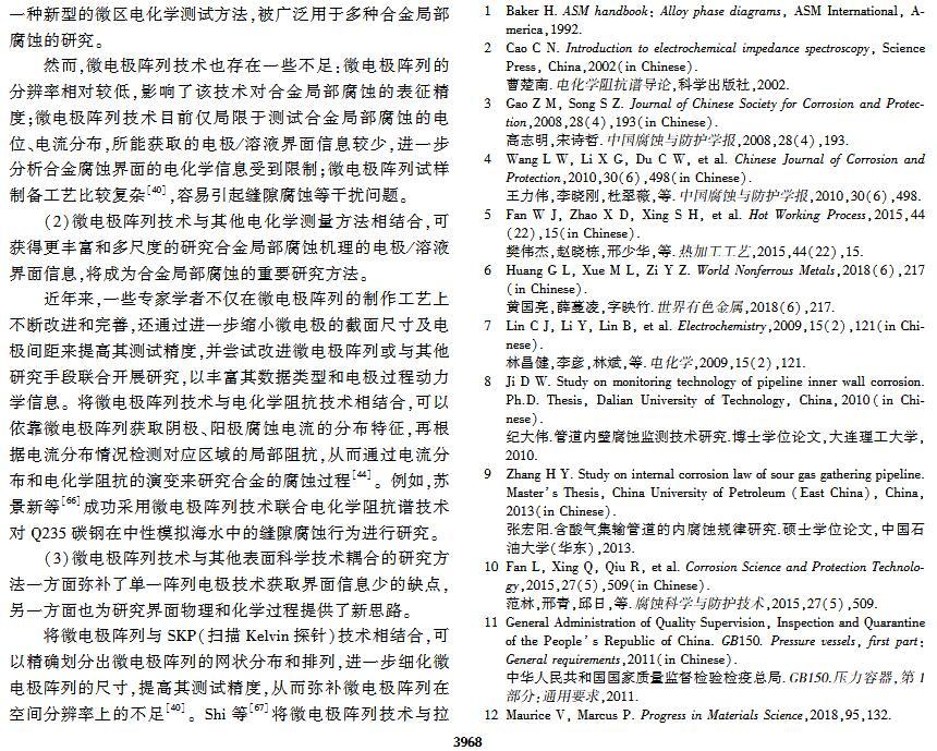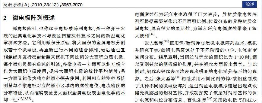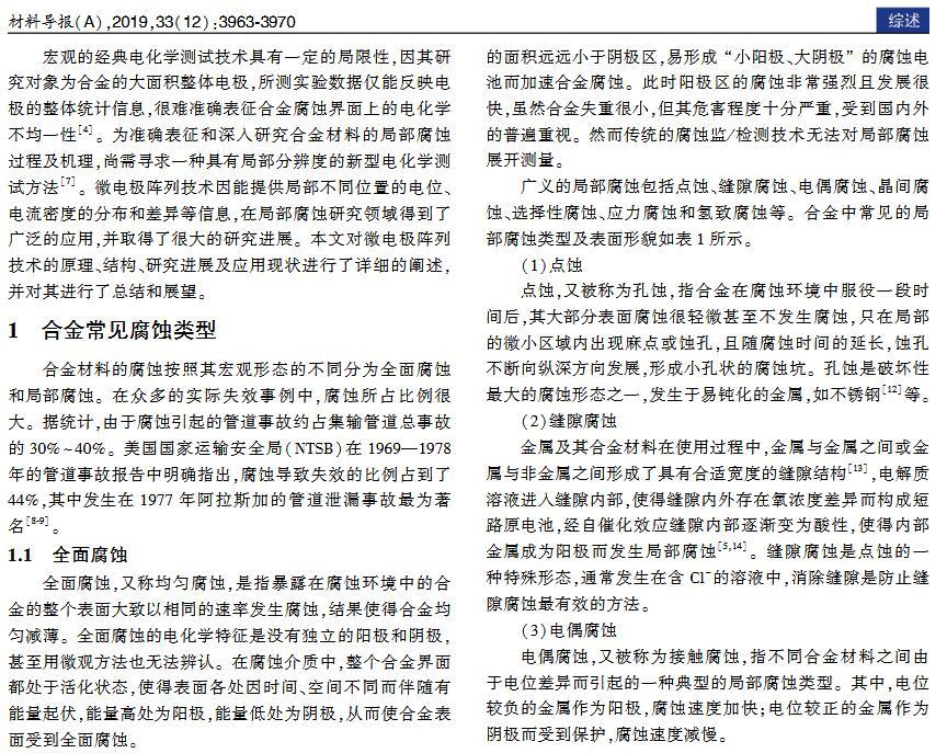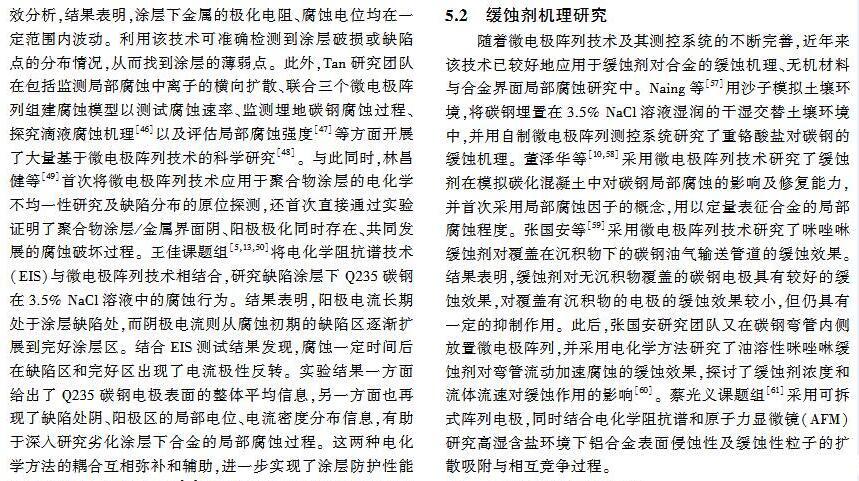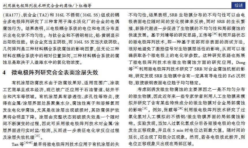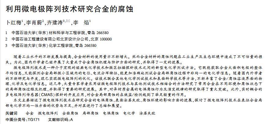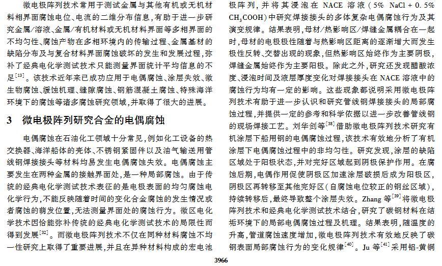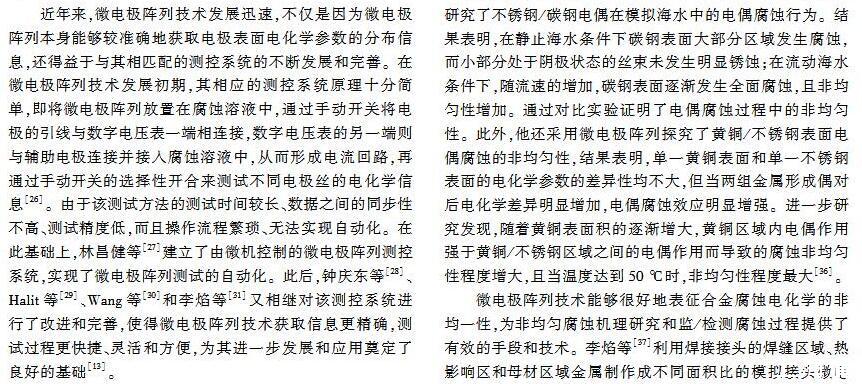 此外,實時耦合的多電極陣列傳感器(CMAS)探針的開發(fā)應用,對合金局部腐蝕的在線監(jiān)/檢測起到了舉足輕重的作用。本文主要綜述了微電極陣列技術(shù)在研究合金的電偶腐蝕、表面涂層失效、腐蝕環(huán)境的影響方面的進展,探討了微電極陣列技術(shù)在表征合金局部電化學不均一性方面的優(yōu)勢與不足,并對其進行了總結(jié)和展望。