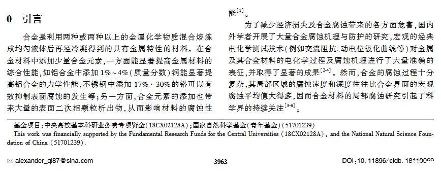 【摘要】:隨著工業(yè)水平的不斷發(fā)展與提高,合金材料的使用量亦不斷增大。然而合金材料的腐蝕問題在工業(yè)生產(chǎn)及生態(tài)環(huán)境中造成了不可估量的損失。為此,國內(nèi)外學者已經(jīng)開展了大量關(guān)于合金腐蝕機理與防護方面的研究,并取得了一定的進展。微電極陣列技術(shù)是一種介于宏觀的經(jīng)典電化學技術(shù)和微區(qū)掃描探針技術(shù)之間的新型電化學測試方法。它既能獲取合金大面積電極的整體平均信息,又能探測合金局部微小區(qū)域內(nèi)的電位、電流分布特征,能更加準確地測試合金局部腐蝕過程中非均一的電化學信息。