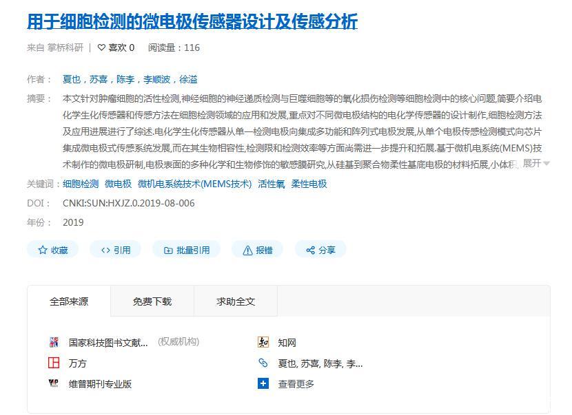 【摘要】:本文針對腫瘤細胞的活性檢測、神經細胞的神經遞質檢測與巨噬細胞等的氧化損傷檢測等細胞檢測中的核心問題,簡要介紹電化學生化傳感器和傳感方法在細胞檢測領域的應用和發展,重點對不同微電極結構的電化學傳感器的設計制作、細胞檢測方法及應用進展進行了綜述。