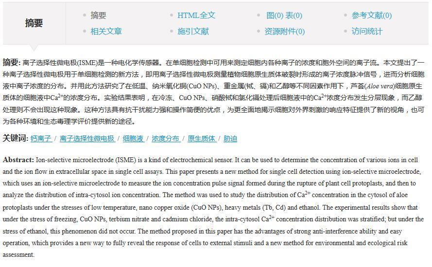 【摘要】:離子選擇性微電極(ISME)是一種電化學(xué)傳感器。在單細(xì)胞檢測中可用來測定細(xì)胞內(nèi)各種離子的濃度和胞外空間的離子流。本文提出了一種離子選擇性微電極用于單細(xì)胞檢測的新方法,即用離子選擇性微電極測量植物細(xì)胞原生質(zhì)體破裂時形成的離子濃度脈沖信號,進(jìn)而分析細(xì)胞液中離子濃度的分布。