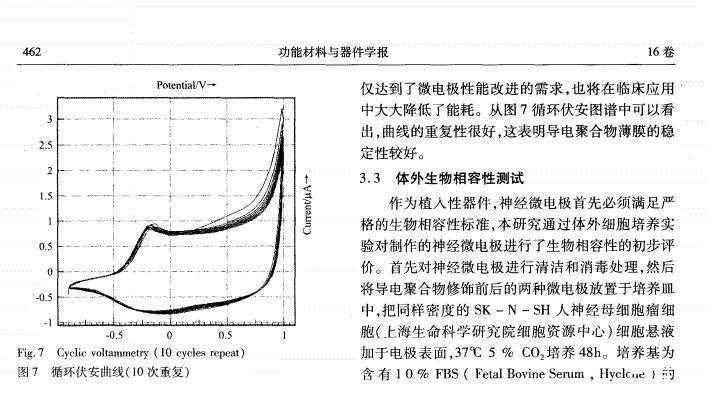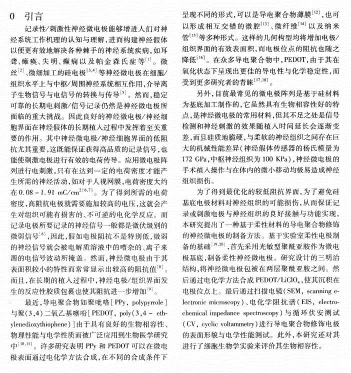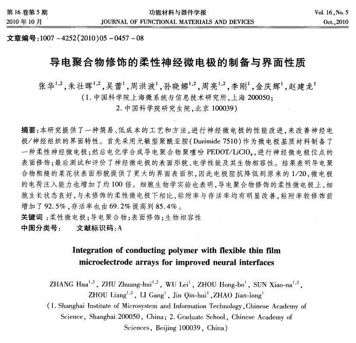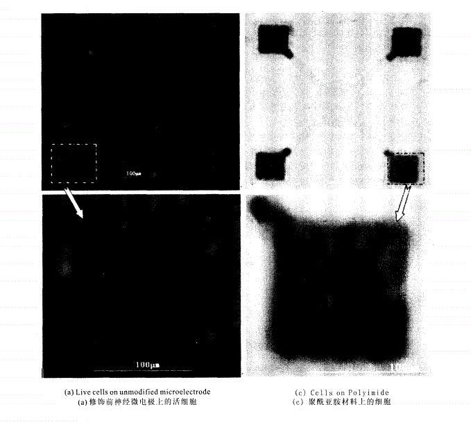 結(jié)果表明導(dǎo)電聚合物粗糙的菜花狀表面形貌提供了更大的界面表面積,因此電極阻抗降低到原來的1/20,微電極的電荷注入能力也增加了約100倍。細胞生物學(xué)實驗也表明,導(dǎo)電聚合物修飾的柔性微電極上,細胞生長狀態(tài)良好,與未修飾的柔性微電極下相比,粘附率與存活率均有明顯改善,粘附率較修飾前增加了92.5%,存活率也由69.2%提高到85.4%。