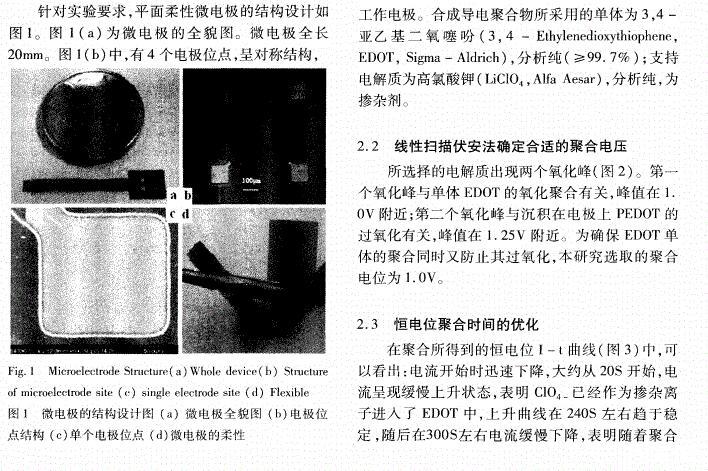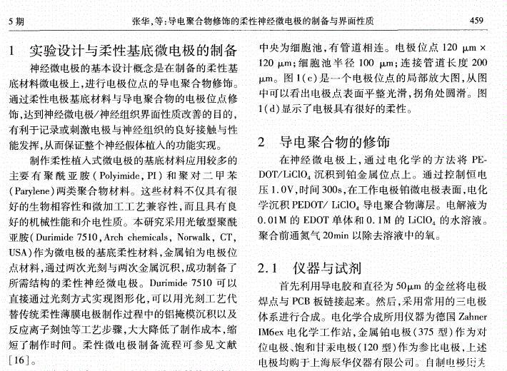 【摘要】:本研究提供了一種簡易、低成本的工藝和方法,進行神經(jīng)微電極的性能改進,來改善神經(jīng)電極/神經(jīng)組織的界面特性。首先采用光敏型聚酰亞胺(Durimide 7510)作為微電極基質(zhì)材料制備了一種柔性神經(jīng)微電極;然后電化學(xué)合成導(dǎo)電聚合物聚噻吩PEDOT/LiClO4,進行神經(jīng)微電極位點的表面修飾;最后測試和評價了神經(jīng)微電極的表面形貌、電學(xué)性能及其生物相容性。