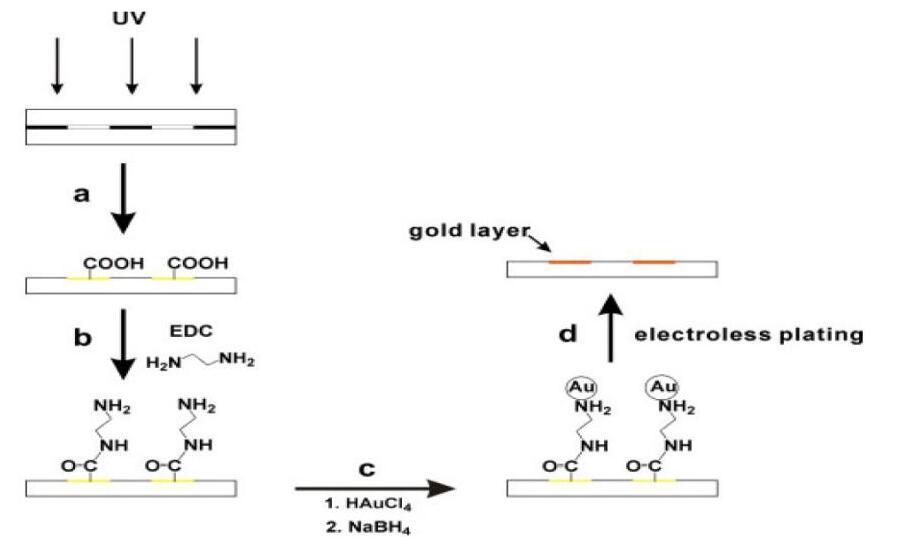 圖2在聚苯乙烯薄片上制備電極的步驟圖解[10]。(a)紫外照射;(b)氨基;(c)金納米粒子;(d)金層