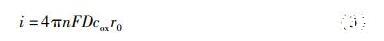 D為擴散系數(shù),r為電極半徑。r越小,擴散速率越快。與此同時,當(dāng)電極表面?zhèn)髻|(zhì)速率快時,反應(yīng)物向電極表面?zhèn)鬏數(shù)倪^程中不受干擾。因此,可使用微電極研究速率較快的電化學(xué)反應(yīng)[28]。基于上述微電極傳質(zhì)規(guī)律可得到微電極的穩(wěn)態(tài)擴散電流,公式如下: