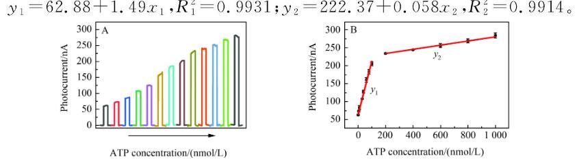 圖2(A)微傳感器與不同標(biāo)準(zhǔn)濃度ATP反應(yīng)后的光電流響應(yīng);(B)光電流大小與ATP濃度之間的線性關(guān)系