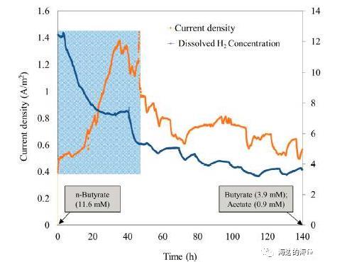 微電極測試燃料生物電池中體系中正丁酸發酵至醋酸生成的氫氣的濃度隨時間的變化情況