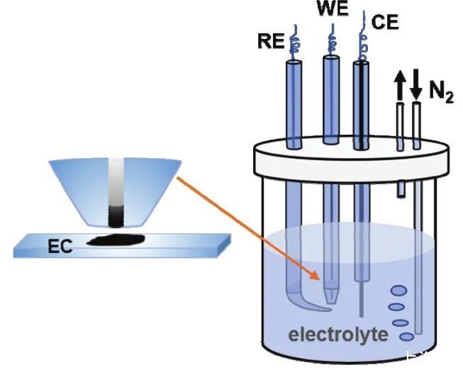 粉末微電極的制備方法參照文獻18。將直徑為100μm的鉑絲一端熱封于玻璃管中,另一端用銅絲連接作為集流體引出;打磨電極端面制成鉑微盤電極,然后將電極浸入微沸的王水中腐蝕,使鉑溶解形成具有一定深度的微腔,制成空腔微電極(圖1c)。通過超景深三維顯微鏡測量,可知微腔直徑為100μm,深度約為77–78μm(圖1d)。取適量制備的碳粉置于光滑的平板玻璃表面,以微電極研磨碳粉使其逐漸填滿微腔,將所制得的電極用于后續電化學測試。制得的粉末微電極填充碳粉前后的光學照片如圖1a,b所示。以填充有碳粉的粉末微電極為工作電極,鉑絲為對電極,飽和甘汞(SCE)電極作為參比電極,組成電化學測試體系,電解液選用陰、陽離子半徑不同的Na2SO4、(NH4)2SO4和Na2S2O8溶液以及質子惰性電解質Bu4NClO4-乙腈溶液,循環伏安(cyclic voltammetry,CV)測試掃描速率為50 mV·s-1。圖2為測試體系示意圖,測試前體系通氮氣除氧。