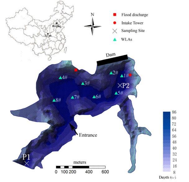 圖1、金盆水庫(JPR)水深、升水曝氣、采樣點位置示意圖。當(dāng)水位高度為586 m時,根據(jù)水深(m)繪制等高線圖。