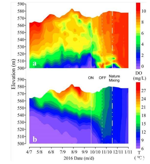 圖2、2016年WLAs運(yùn)行期間P2站點水柱氧(a)、溫度(b)剖面分布情況。