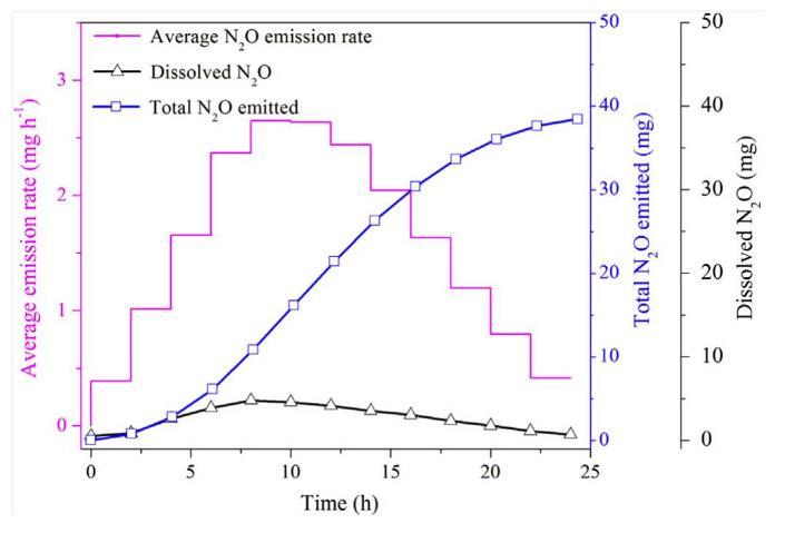 圖3、在SBBR的典型循環(huán)系統(tǒng)中,平均N 2O排放速率(mg/h),總N 2O排放(mg)和溶解N 2O(mg)。