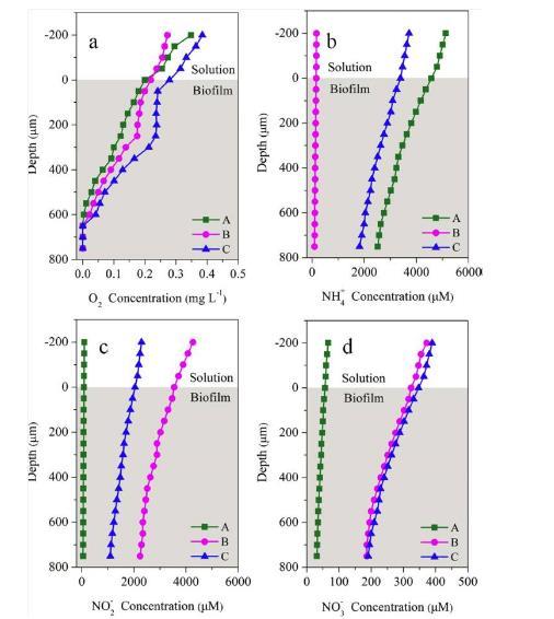 圖4、測試生物膜內(nèi)的O2,NH4+,NO2-和NO3-。其中試驗A,B和C在所述生物膜內(nèi)的O2,NH4+,NO2-和NO3–是4小時后測試的。