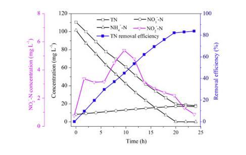 圖2、在SBBR的典型循環(huán)過程中,NH4+-N,NO2--N,NO3-N和TN的變化.